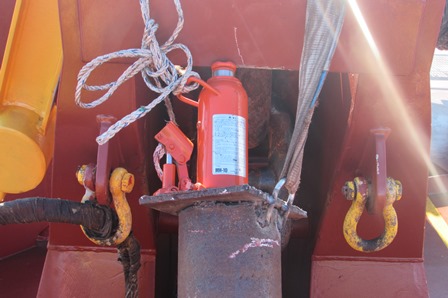 And since calling a tug to move the anchor seemed expensive in the anchorage off Montevideo , the company allowed CE to try out my earlier proposal of pushing it out hydraulically. Earlier they had denied the permission citing safety concerns!! We made  a contraption consisting of a pipe ,a manual hydraulic jack and a fabrication to prevent the pipe from sliding. We kept the anchor chain a little slack ,and with the help of the jack pushing against the pipe ,which in turn was resting on the d-shackle of the anchor , we could successfully push the anchor out.