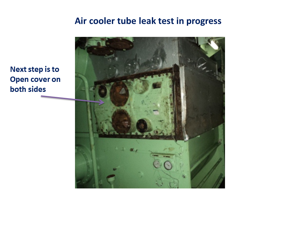 If the tube leak is small, it is difficult to identify the leak, in one case it could not be identified with auxiliary blower air pressure, which is usually only 0.1 bar. Crew were under pressure to find the leaky tube but their whole exercise was in ineffective, fortunately vessel was in anchorage, chief engineer decided to run the engine with air cooler end covers opened, master permission was sought to run the engine at dead slow for few minutes, at this speed air pressure was sufficient to deflect the candle light and leaky tube was identified successfully. After identifying the leaky tube the plugging of tube is not a time consuming job.