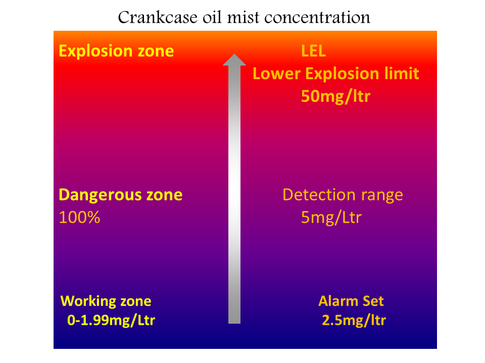 These oil mist at 13% oil mist/air ratio, 47mg/liter approximately, reaches to lower explosion limit (LEL) and any contact with hot spot at 850deg C will cause explosion. The engine running parts consists of any bearing, crankshaft, gears, chain, camshaft bearings, piston rod and pistons in cylinder liners(in 4 stroke engine).