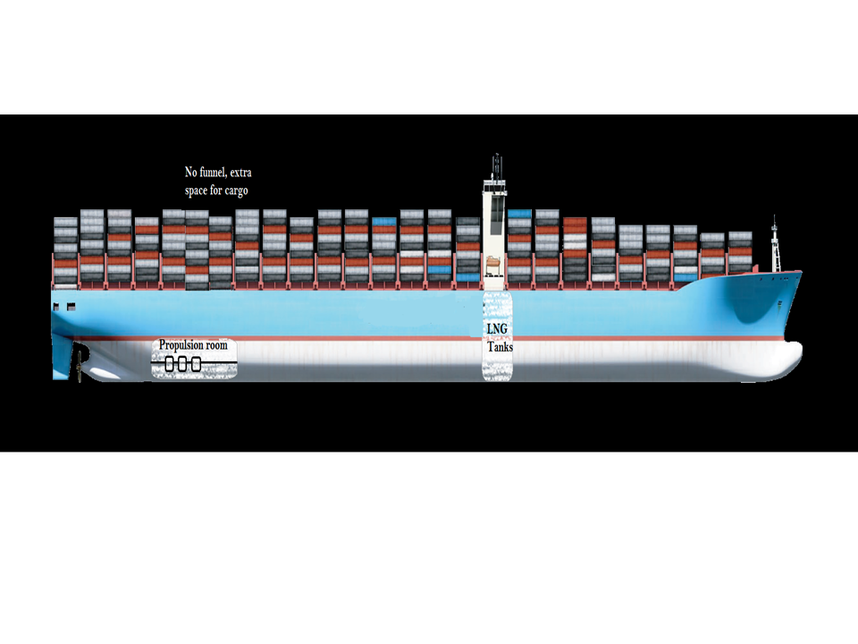 The two 10,960 m³ LNG fuel tanks are located below the deck house, giving the vessel enough fuel capacity for an Asia/Europe round trip. With the gas and steam turbines integrated at deck level within the same deck house as the tanks, the space normally occupied by the conventional engine room can be used to increase cargo capacity significantly.
